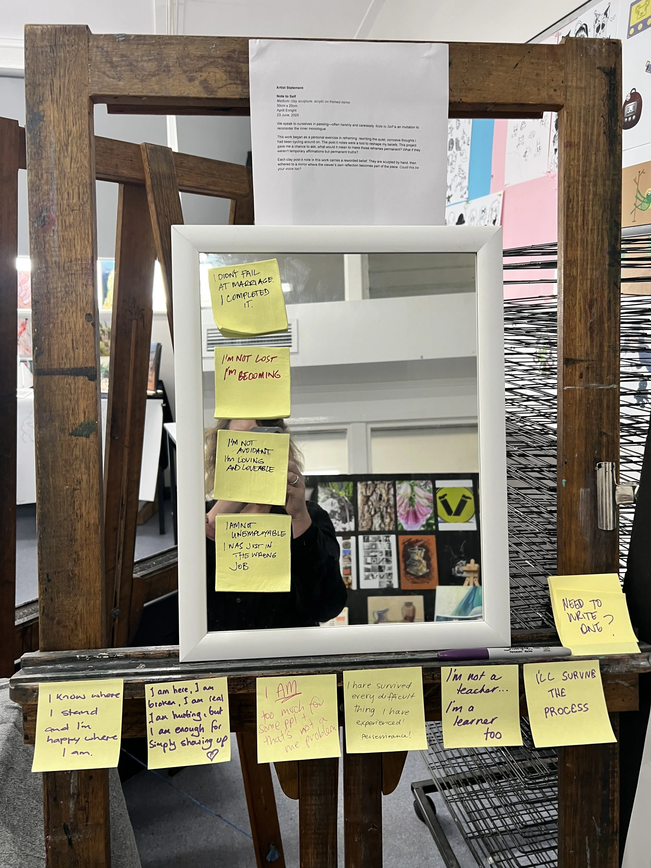 Note to Self. 2025. Clay sculpture and acrylic paint, on framed mirror. 30cm x 20cm.
